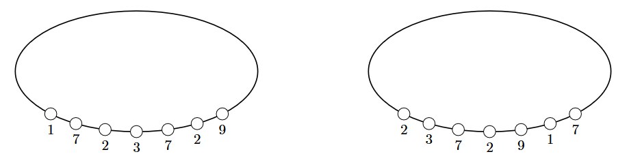 Bajtazar 的妻子买了一条美丽的项链,由若干颗珍珠依次挂在构成圆形环状的链子上。当佩戴项链时,所有珍珠都位于颈前,而头后是一段没有珍珠的链子。然而珍珠并非永久固定在链子上:可以将任意数量的末端珍珠沿链子绕过头部,移到项链的另一端。