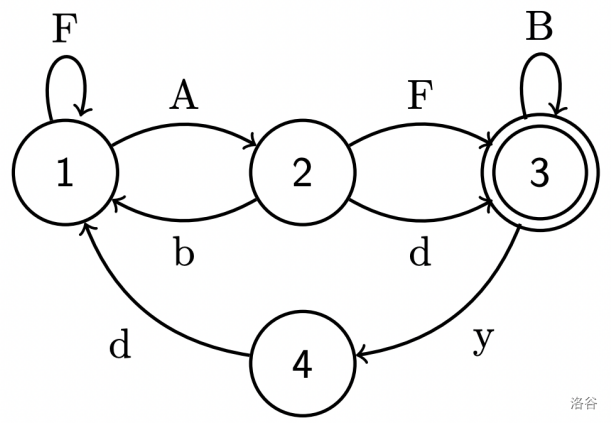 A product can be produced by the factory if by starting at station there is a sequence of edges that can be followed, ending at a station in , whose edge labels can be concatenated, in order, to create the product. The sequence of edges can be empty if . For example, the following strings can all be produced by the factory described in the first sample input and illustrated in the figure: AF, FAFB, AbFFAd, AdydAd. Note that this is not an exhaustive list.