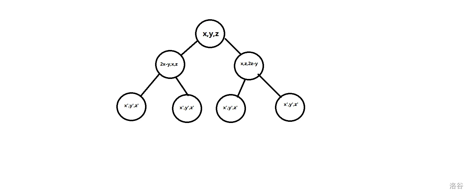 可以发现,对于每一组(x,y,z)都有唯一对应的一个根,而且二叉树之间的任意一组(x,y,z)都可以互相转化,而且转化的操作次数就等于两个状态在树上的距离